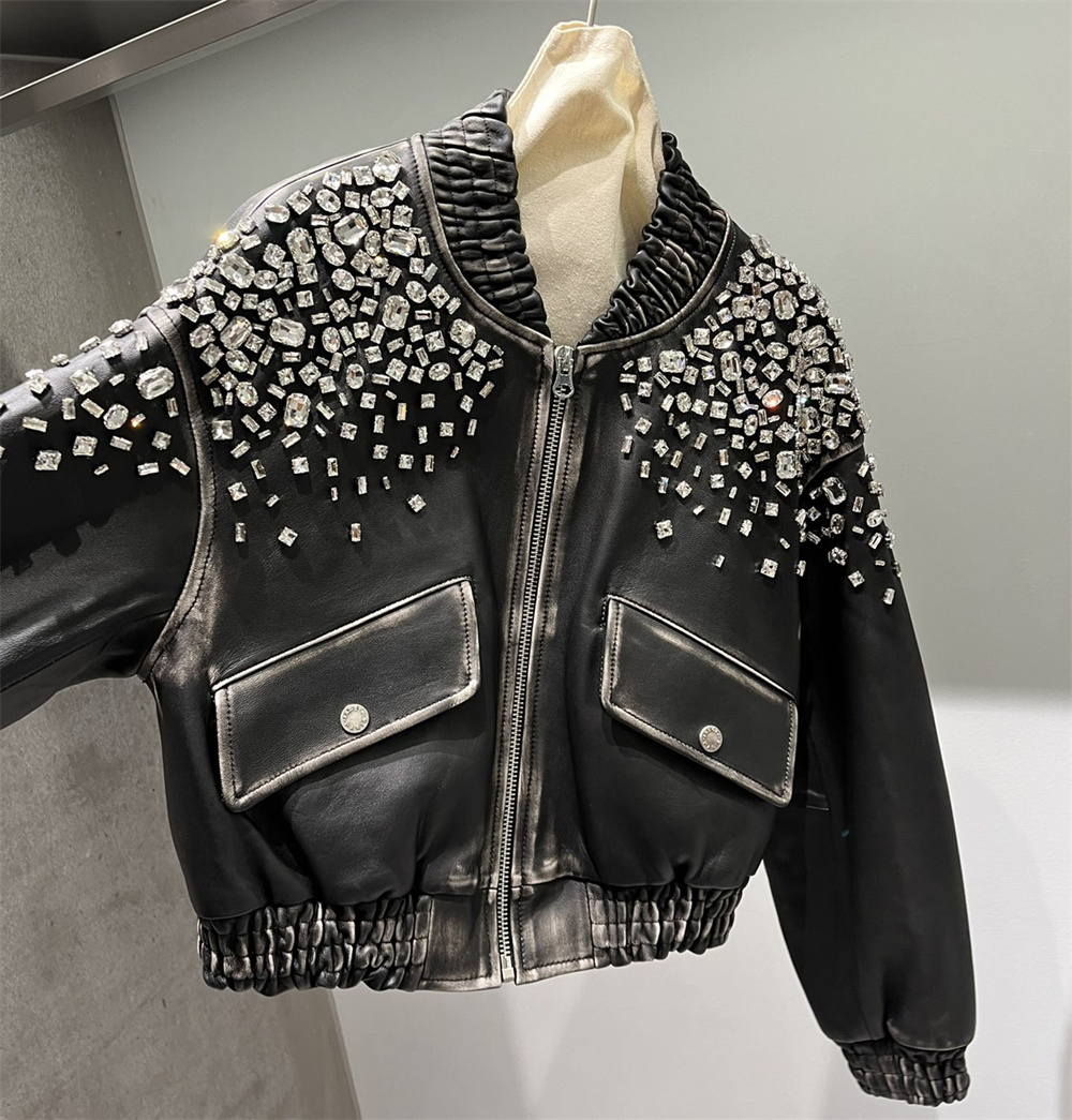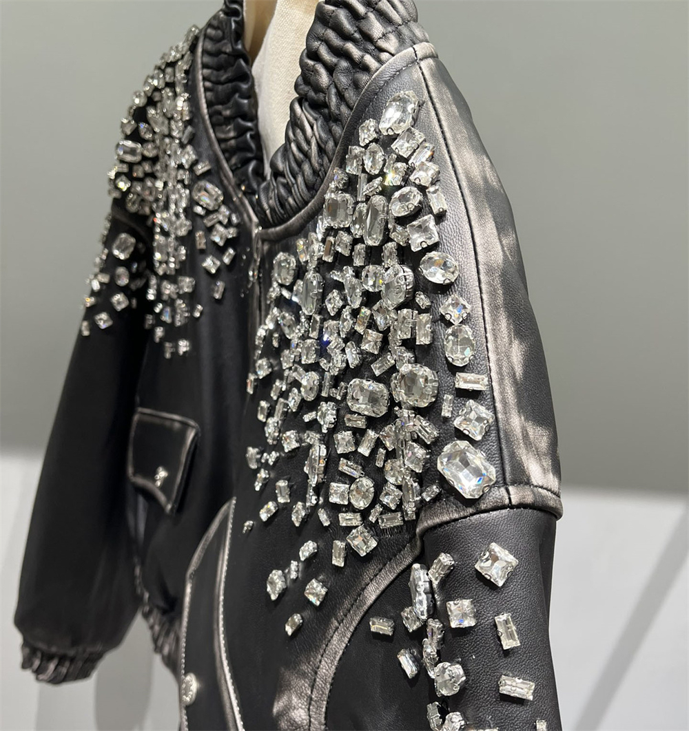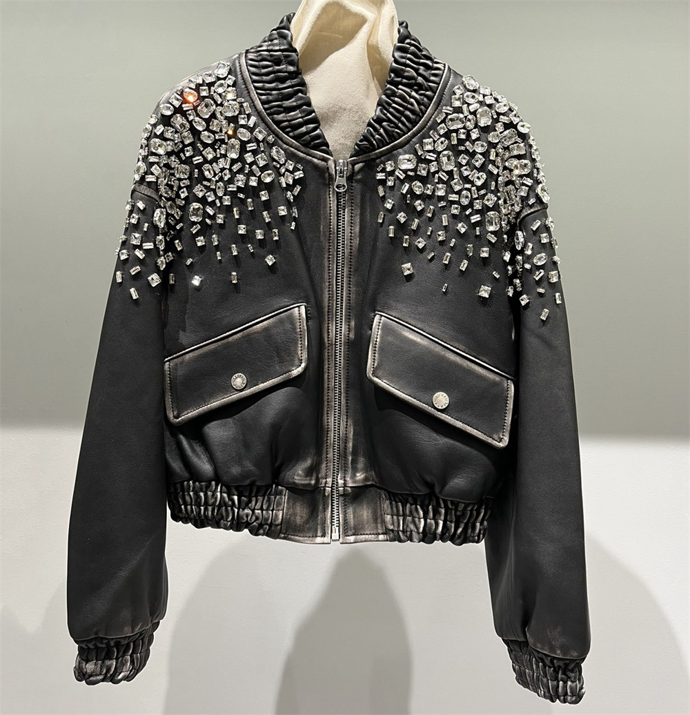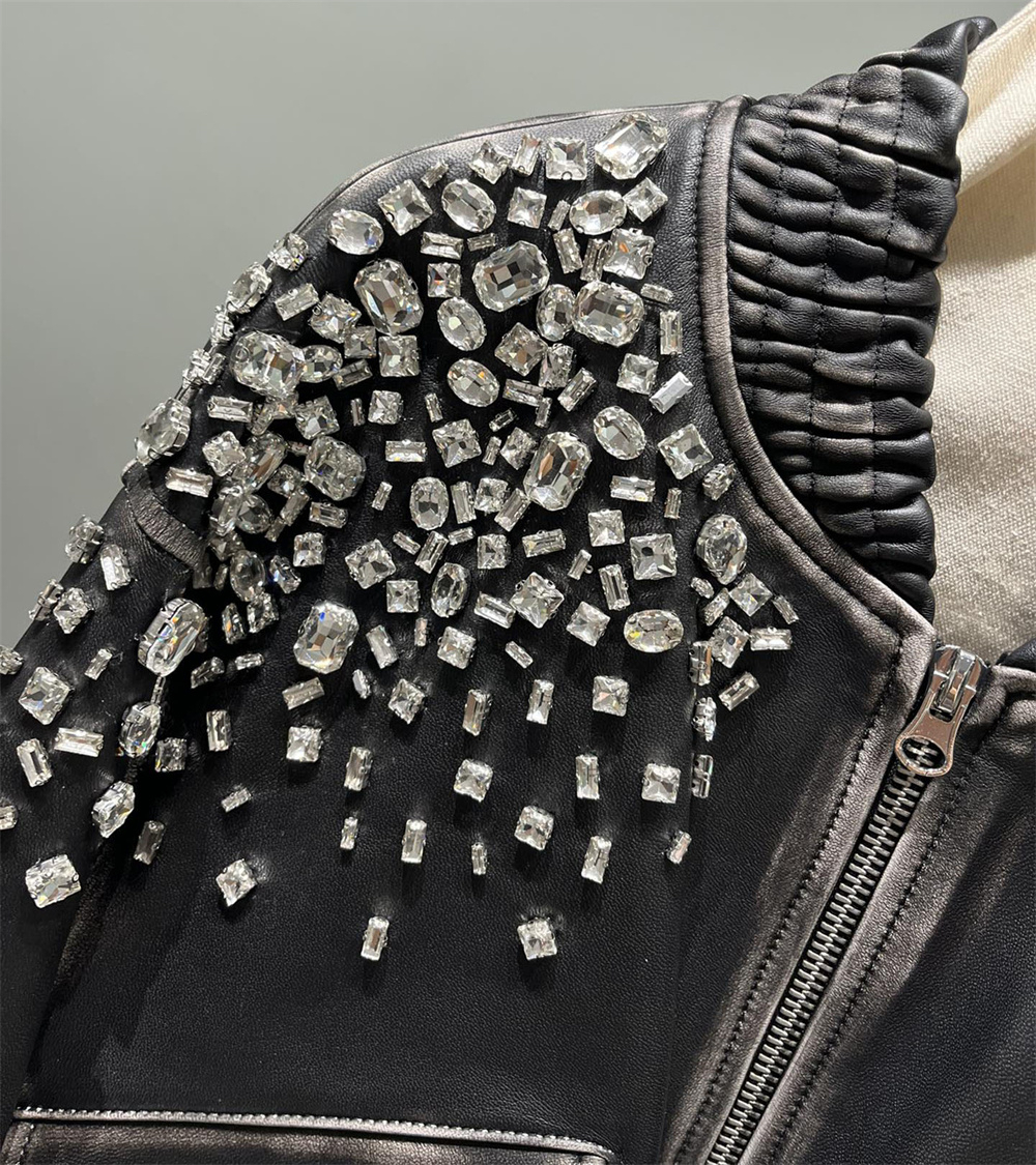 Bold, dazzling, and unstoppable premium men’s leather jacket is crafted from high-quality genuine leather and adorned with striking rhinestone details for a head-turning look. Designed for those who love to stand out, it features expert stitching, a sleek fit, and a comfortable inner lining.